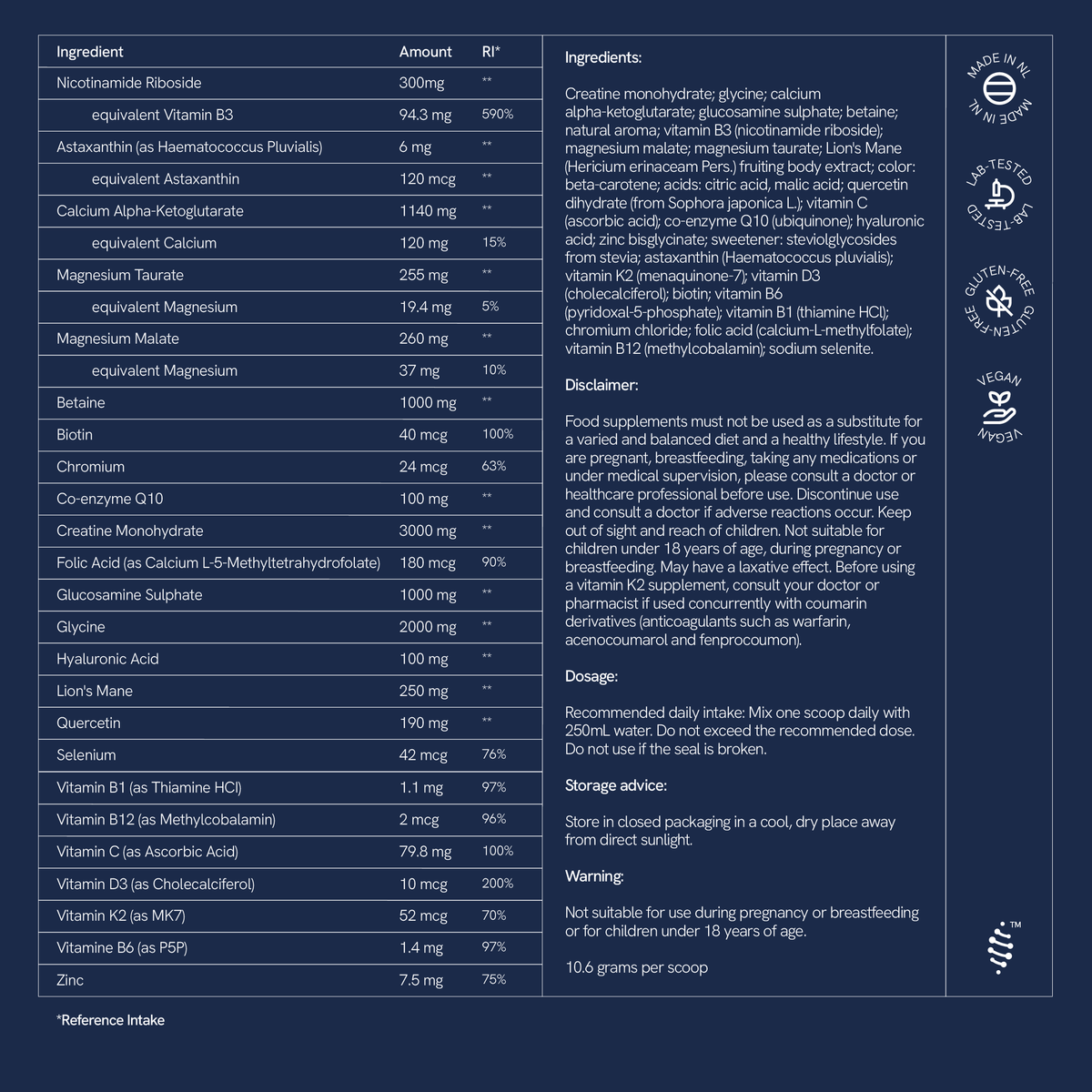 It contains a clinically dosed NAD⁺ precursor along with longevity-focused actives, essential vitamins, minerals, antioxidants, and amino acids. Each nutrient supports authorised functions such as energy metabolism, cognitive and psychological function, immune support, muscle function, and collagen formation.